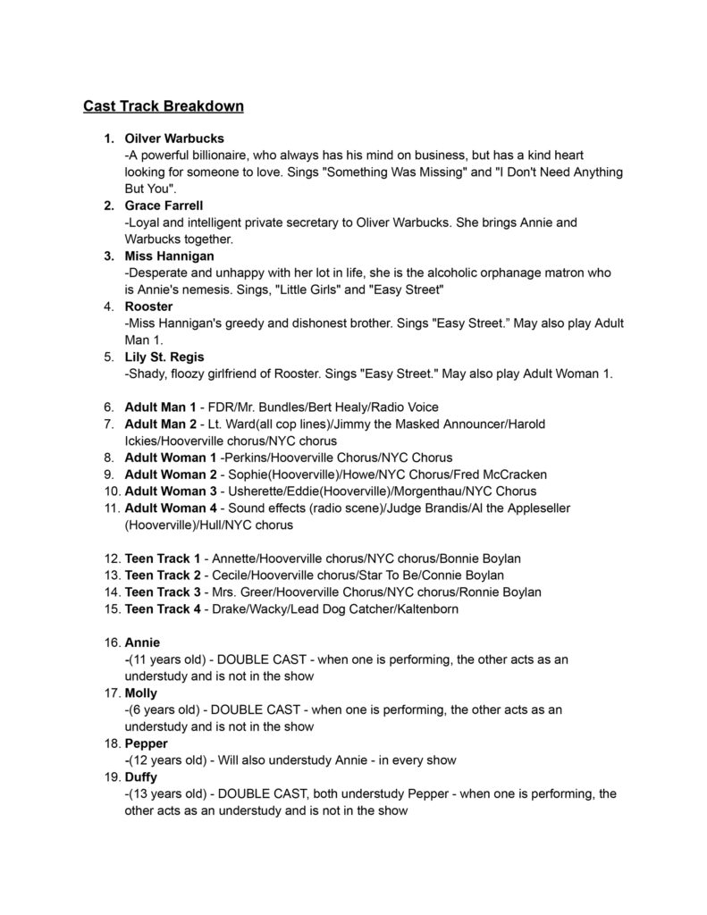 AUDITION MATERIALS: Vocal auditions will be seen on an individual basis. This will be followed by a group dance audition. Afterward, select individuals will be asked to read from the script. Please prepare a 30 second-1 minute cut of a song from the show to be sung during the audition. Links to the tracks that we will be using for the auditions will be listed in the comments below. The production staff will have the tracks on-hand to play during the audition. It is very helpful if you can provide a time stamp of where to stop and start. A cappella auditions will not be seen.