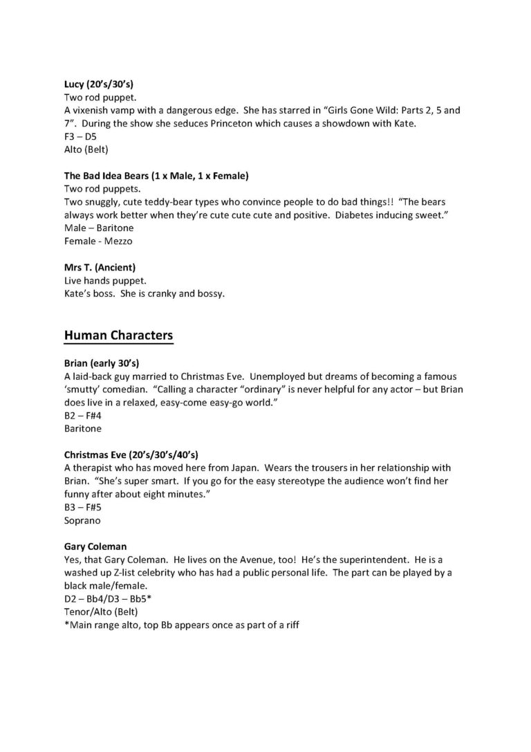 AUDITION MATERIALS: Vocal auditions will be seen on an individual basis. This will be followed by a group dance audition. Afterward, select individuals will be asked to read from the script. Please prepare a 30 second-1 minute cut of a song from the show to be sung during the audition. Links to the tracks that we will be using for the auditions will be listed in the comments below. The production staff will have the tracks on-hand to play during the audition. It is very helpful if you can provide a time stamp of where to stop and start. A cappella auditions will not be seen.
